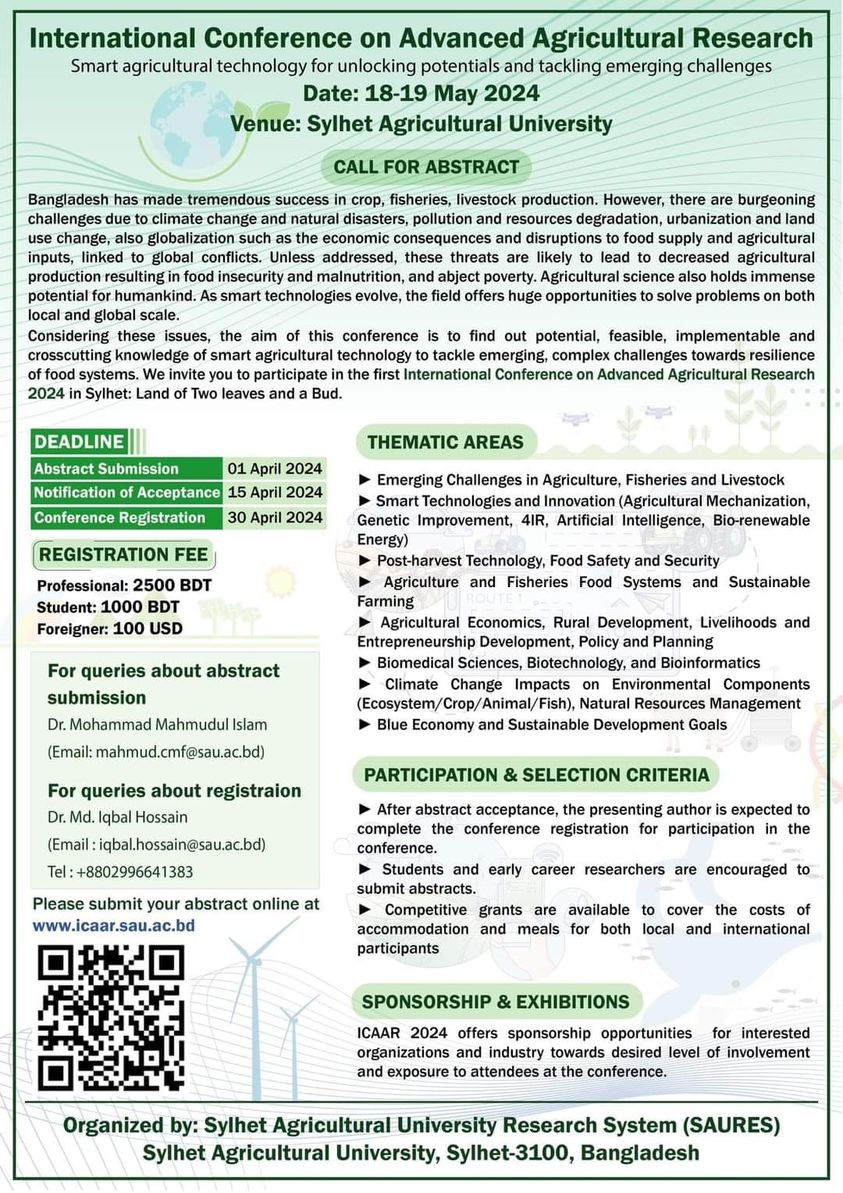 Sylhet Agricultural University (SAU) was established in 2nd November 2006 to provide facilities for higher education, research and extension in all branches of agricultural sciences. Sylhet Agricultural University Research System (SAURES) was established through an Ordinance approved in 2008. Since then, the project-based research activities carried out by the teachers of different Faculties of SAU came under the direct management of SAURES. The main responsibility of SAURES is the administration and management of all research projects of the University. It promotes the development of collaboration among different institutions, Universities and donor agencies at home and abroad...Read More